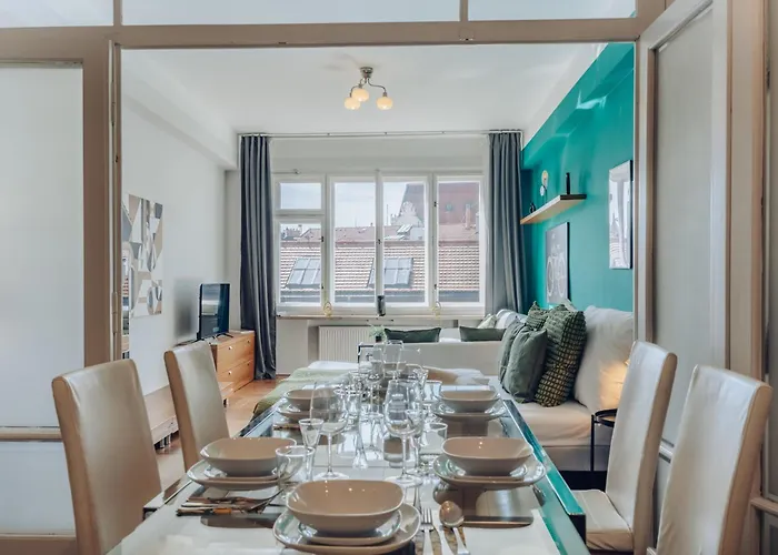 Downtown 2Bd Riverside Apartment Near Dancing House, di 90 m², è dotato di servizi di self-catering come un bollitore elettrico, una lavastoviglie e una vetreria, per dare agli ospiti l'indipendenza di preparare i propri pasti. La stazione della metropolitana Národní è a soli 10 minuti a piedi, ciò offre un collegamento con zone popolari di Praga.